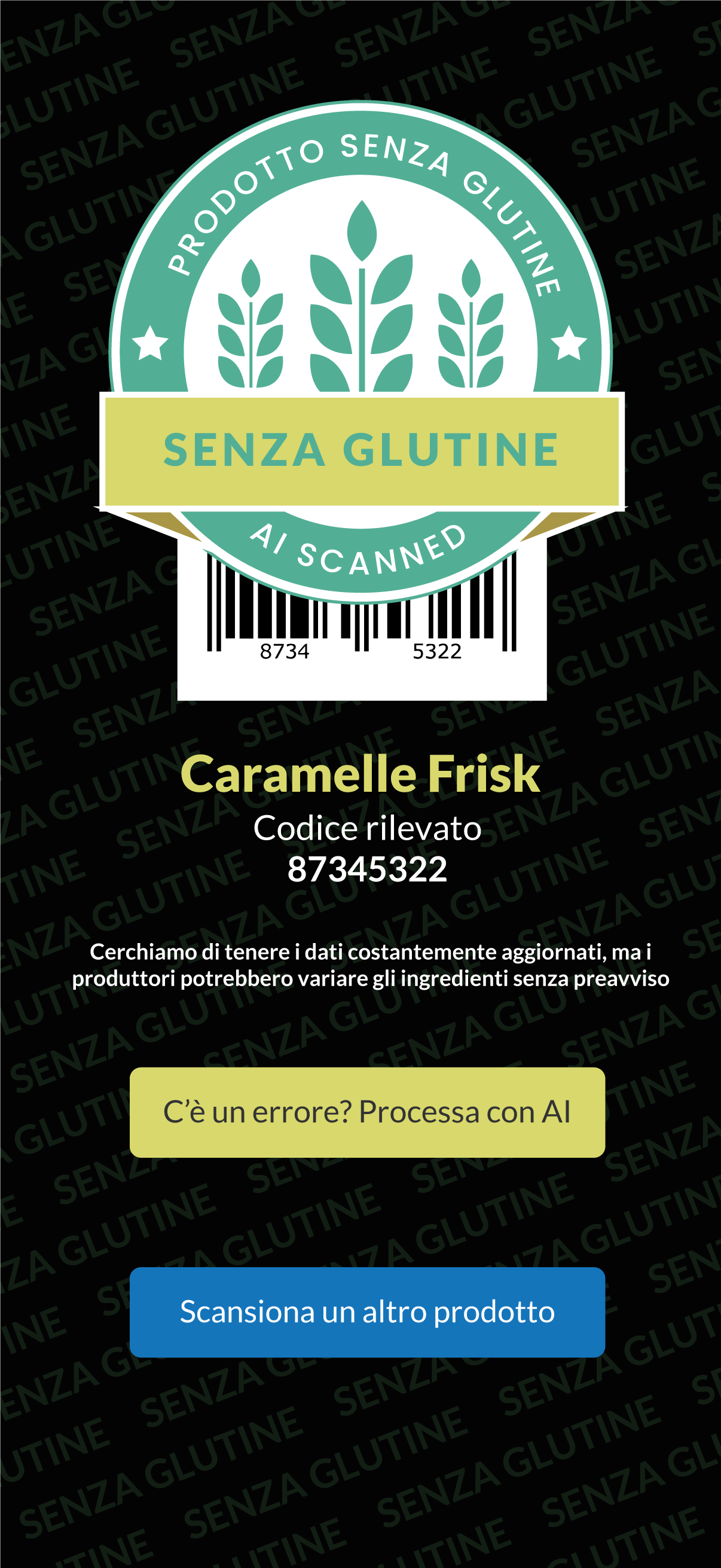 Se un prodotto non è ancora registrato o manca la sua catalogazione completa, basta scattare una foto all’etichetta degli ingredienti. Grazie ad avanzati algoritmi di computer vision e intelligenza artificiale, l’analisi avviene in tempo reale, determinando immediatamente la presenza di glutine e aggiornando il database senza attese.